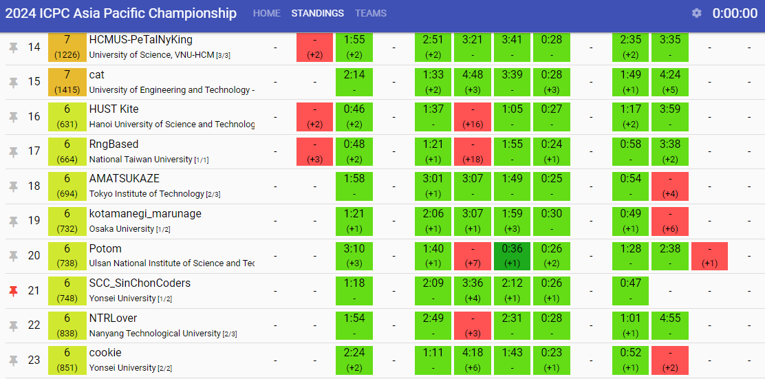 21등 아... 진짜 F번에서 마지막 페널티만 안쌓았으면 2등이 더 올라가는 건데.. 너무 아쉬웠습니다. 그리고 이때 제가 잘못 들었던 것 같은데 저는 우승자팀까지 합쳐서 12팀이 간다는 줄 알았는데 그게 아니고 뭐.. 어찌저찌 16팀 정도가 간다고 하는 것 같습니다. 그래서 그때는 아 사실 많이 멀었구나 했는데 지금와서 생각해보니 진짜 너무너무 간당한 성적입니다. 이건 좀더 지켜봐야 될 것 같습니다.