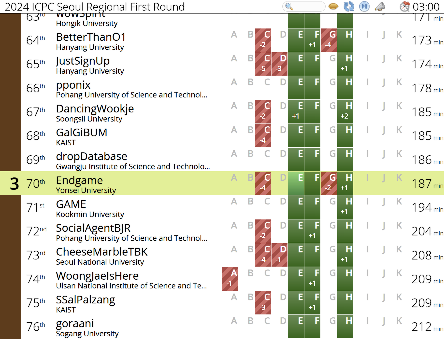 좃망 결국 끝나고 스코어보드를 열었는데 70등이였고.. 저는 멘탈이 완전 갈려서 그냥 귀신 본 사람처럼 정신이 나가있었습니다. 1년동안 ICPC 하려고 휴학을 했는데 예선탈락... 노력했던 시간이 주마등처럼 지나가는거 같았습니다. 다른 팀원들은 그나마 저보다는 상태가 좋아보이긴 했는데.. 뭐 다들 힘들었을 것 같습니다. 아무리 위에 있는 학교 중에서 언오피셜 빼고 학교별 1등팀이 덜 초대된다고 가정해도 75팀 안에 들어갈 리가 없어보였고, 그냥 예선탈락이 확실해 보였습니다. 끝나고 동아리 사람들이랑 회식도 했는데 저는 귀신 본 사람처럼 구석에 짱박혀서 아무말도 안하고 그냥 정신이 나가있었습니다. 지금 돌이켜 생각해봐도 성숙한 행동은 아닌데 그때는 너무 힘들었어서 그냥 아무 생각도 안들었습니다.