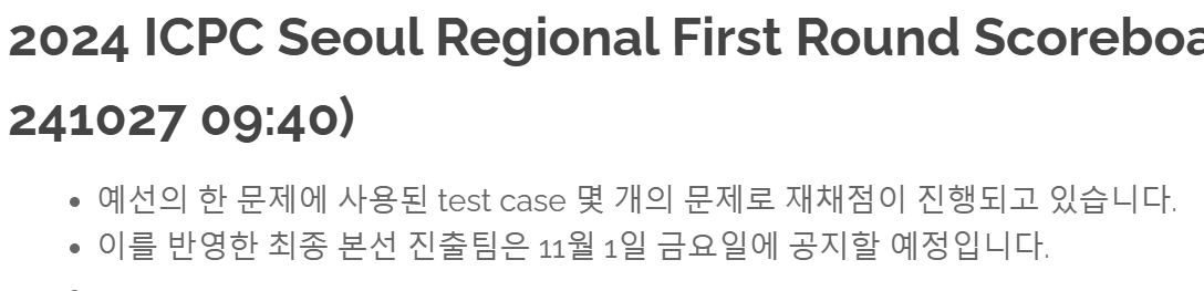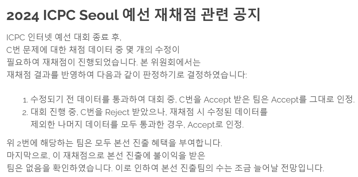 ?? C번에 AC로 제출된 분들의 풀이에 반례가 많이 있었던 것 같은 도중 맞왜틀을 주장하시는 분들이 꽤 있었고 그분들의 풀이가 저희팀의 풀이랑 거의 일치하는 것 같아서 뭔가 이상함을 느꼈고 꽤 많은 분들의 AC코드가 문제가 있다는 제보가 추가되면서 분위기는 약간 데이터오류 쪽으로 흘러가고 있었던 것 같습니다. 저희팀은 C번 문제의 정답여부가 생존과 직결되어 있었기 때문에 최후의 방법으로 코치 교수님을 통해서 다음날 ICPC 본부에 문의를 넣을 생각이였고 자고 일어나보니 아침에 예선 결과에 문제가 있어서 결과 통지가 연기된다는 공지가 올라왔습니다.