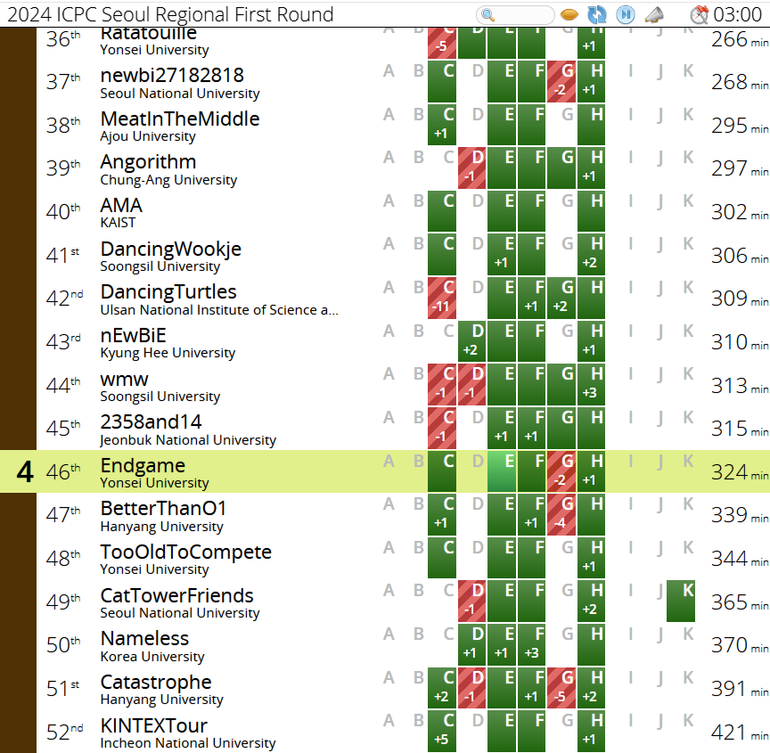 예선 전날까지도 예비소집이 끝나고 연세대 팀들은 동방에 모여서 팀연습을 진행했는데, 저희팀은 전날 팀연습에서 분명 말렸었지만 그래도 준수한 성적으로 방어했기 때문에 그냥 오늘 액땜했고 내일 그냥 떨어지지만 말자~고 팀원들에게 말했지만 사실 속으로 애초에 떨어지는 선택지는 고려한 적이 없었고 몇등할지, 얼마나 잘하는 팀들이 많을지 그런것만 생각하고 있었습니다. 예선 1시간 반이 지날때까지는요....