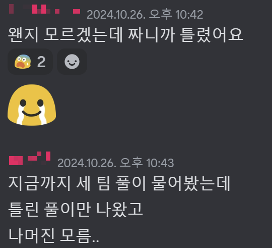 ㄹㅈㄷ 막상 이렇게 되고 나니까 이제는 대회 중 틀렸던 저희 C번 코드가 맞았는지가 너무 중요했습니다. C번을 맞으면 바로 본선 직행인데, 틀렸으면 바로 광탈인게 확실해서 공지될때까지 너무 피말렸고 playsworld16이 평소에도 엄청 꼼꼼하고 오류를 잘 잡는데 용진이가 2시간 넘게 붙잡고 있었던 문제니까 맞았겠지? 하다가도 막연한 불안감에 휩싸여서 결과 발표될때까지 계속 긴장상태로 기분이 오르락내리락 했던 것 같습니다.