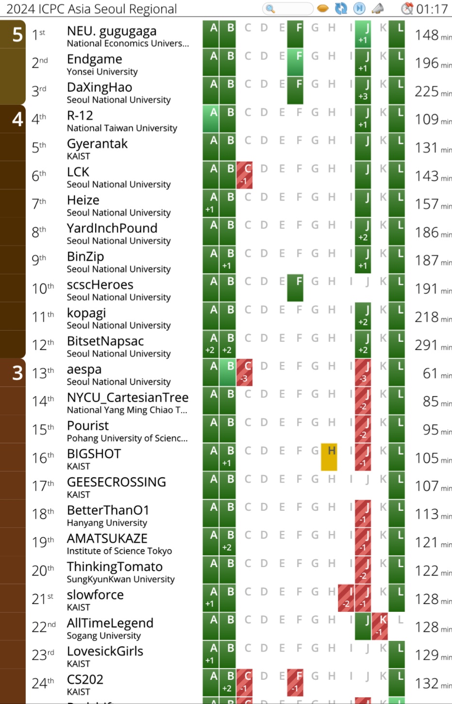 76등의 TooOldToCompete (ez_code, ConU, yup0927) 팀은 이번 첫 본선 진출이고 아마도 내년에는 다른 팀으로 새롭게 등장할 것 같습니다. 이팀은 제가 지금까지 들어본 해프닝 중에서 가장 웃기지만 슬픈 억까썰을 가진 팀입니다. 분명 A와 B를 열심히 짰는데 WA를 받았고, 열심히 디버깅했으나 아무리 봐도 틀린게 없어서 2시간 30분쯤에 제출한 코드를 다운받아서 확인했더니... 맙소사 사실 이상한 파일을 계속 제출하고 있었다고 합니다. 그래서 열심히 cout<<"Hello world"<<endl; 만 제출하고 있었고... 이후에도 프린터가 작동하지 않는 등 억까를 당했지만 헬로월드 억까는 제가 들어본 억까중 가장 웃긴 억까긴 합니다. 아마 10년 뒤 모르고리즘에도 매년 등장하는 이야기가 아닐까...ㅋㅋㅠㅠ