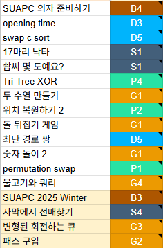 이번 SUAPC는 예전이랑 느낌이 좀 다르네? 라고 생각하면서 풀었고 좀 걱정되는건 이번 SUAPC로 팀 대회를 처음 입문하는 팀들이 이 셋을 마주쳤을 때 많이 좌절하지는 않을까? 라고 생각했습니다. 문제들이 나쁜 건 아니고 정말 좋다고 생각합니다. 그리고 최신 대회들을 잘 하기 위해서는 이런 문제들에 익숙해져야 한다는 생각을 가지고 있기 때문에 정말 좋은 셋이라고 생각합니다. 동시에 대회에 익숙하지 않으신 분들에게는 다소 어렵거나 일부 문제들은 고통스럽게 느껴질 수도 있었던 셋이라고 생각합니다.