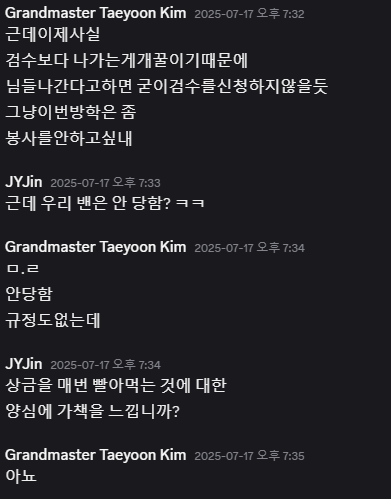 본대회 스코어보드 1위의 저녁 뭐 먹지 (plast, gs22059, juwonhyme) 팀은 Endgame 팀원인 plast가 포함되어 있는 팀이고, JYJin과 제가 모두 검수진으로 납치되는 도중 혼자!!!! 튀고 25학번 후배들과 팀을 만들었습니다. 25학번이지만 둘다 경곽 출신의 고수들이라서 사실 새내기라고 보기는 힘들고, "새내기" 타이틀을 떼고 봐도 그냥 잘하는 사람들입니다. 우승할 것으로 강하게 예측한 팀이었고 조금 고전했지만 결국 우승했다고 합니다. 연세대에서 흔치 않은 적폐학교출신이라 잘 키워서 월파에 보낼수 있으면 좋겠습니다.