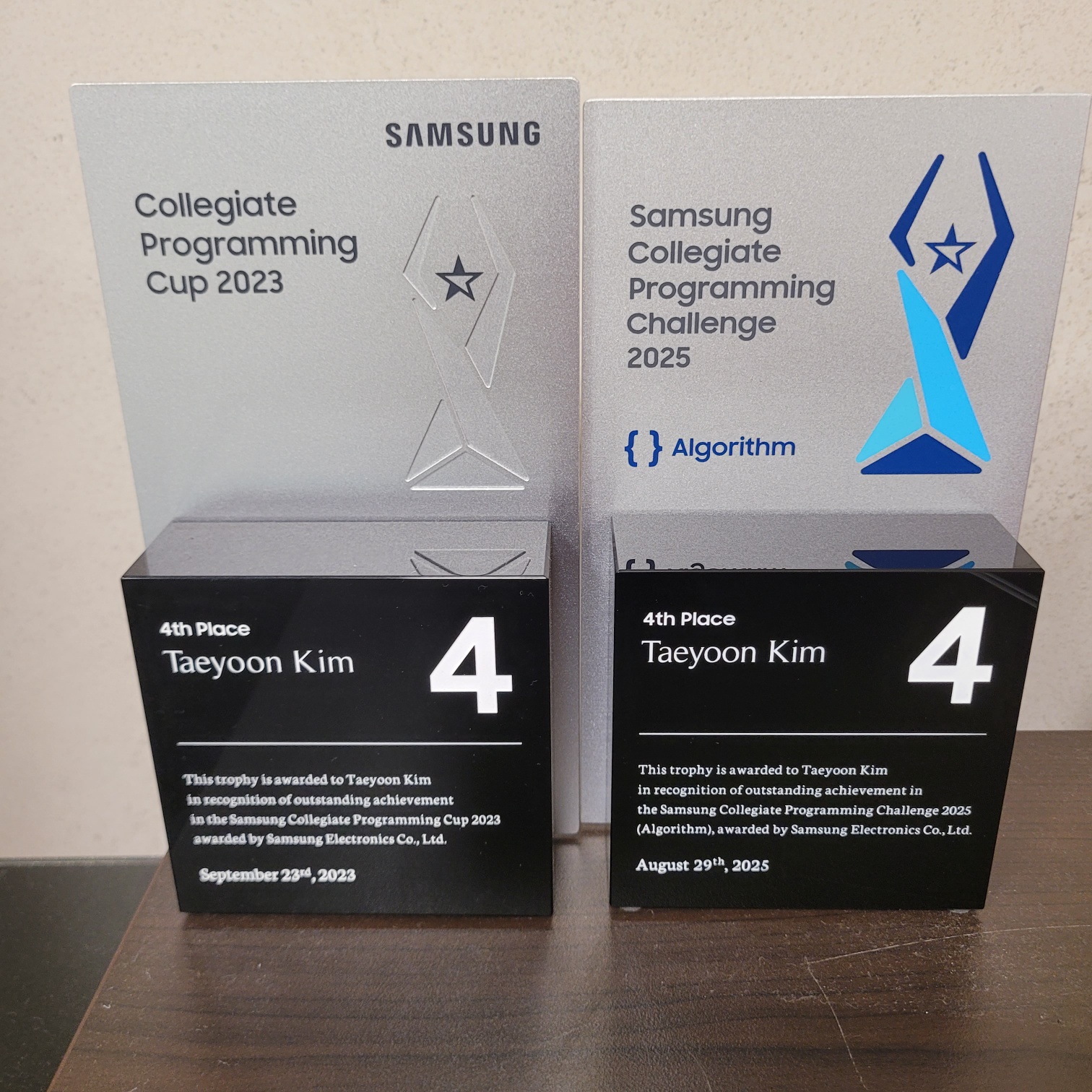 올해도 예쁜 트로피를 주네요 올해 SCPC는 알고리즘 트랙과 AI트랙을 나눠서 진행했고, 알고리즘 트랙의 수상 인원이 절반 이하(18명)로 줄었습니다.