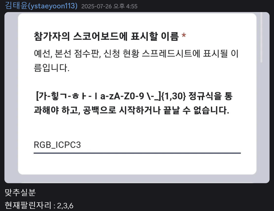UCPC 본선장에서 후원사 세션때 잡담을 하다가 RGB_ICPC 한 10명정도가 나오면 재밌을 것 같아서 팀연습 디코에서 맞출분~ 하고 충동적으로 신청을 했는데 막상 팔린자리는 2,3,6밖에 없었다고 합니다.